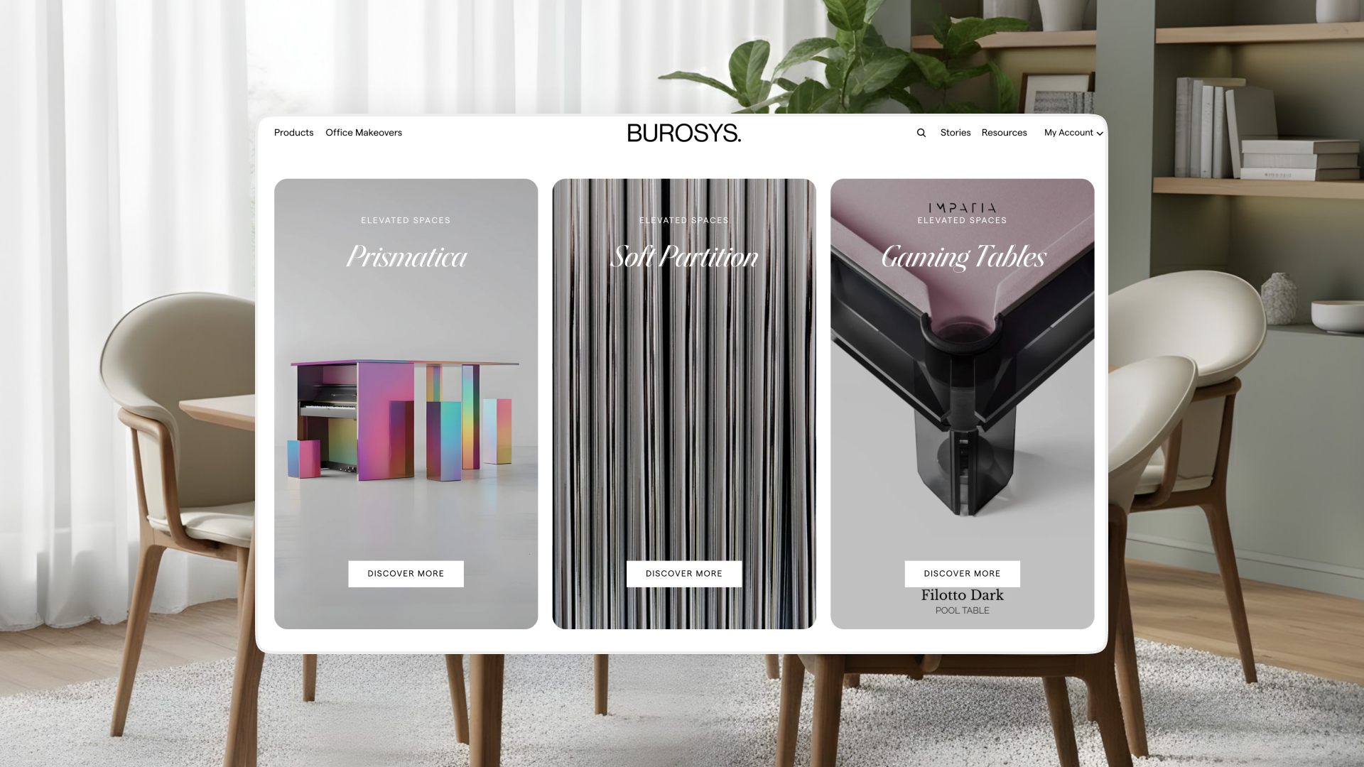 A layered navigation system was created for Elevated Spaces, where each category opens into its own distinct environment. For example, Gaming Tables appears as its own realm within the website as a collaboration between Burosys and Impatia, supported by custom header animations and dedicated content structures.
